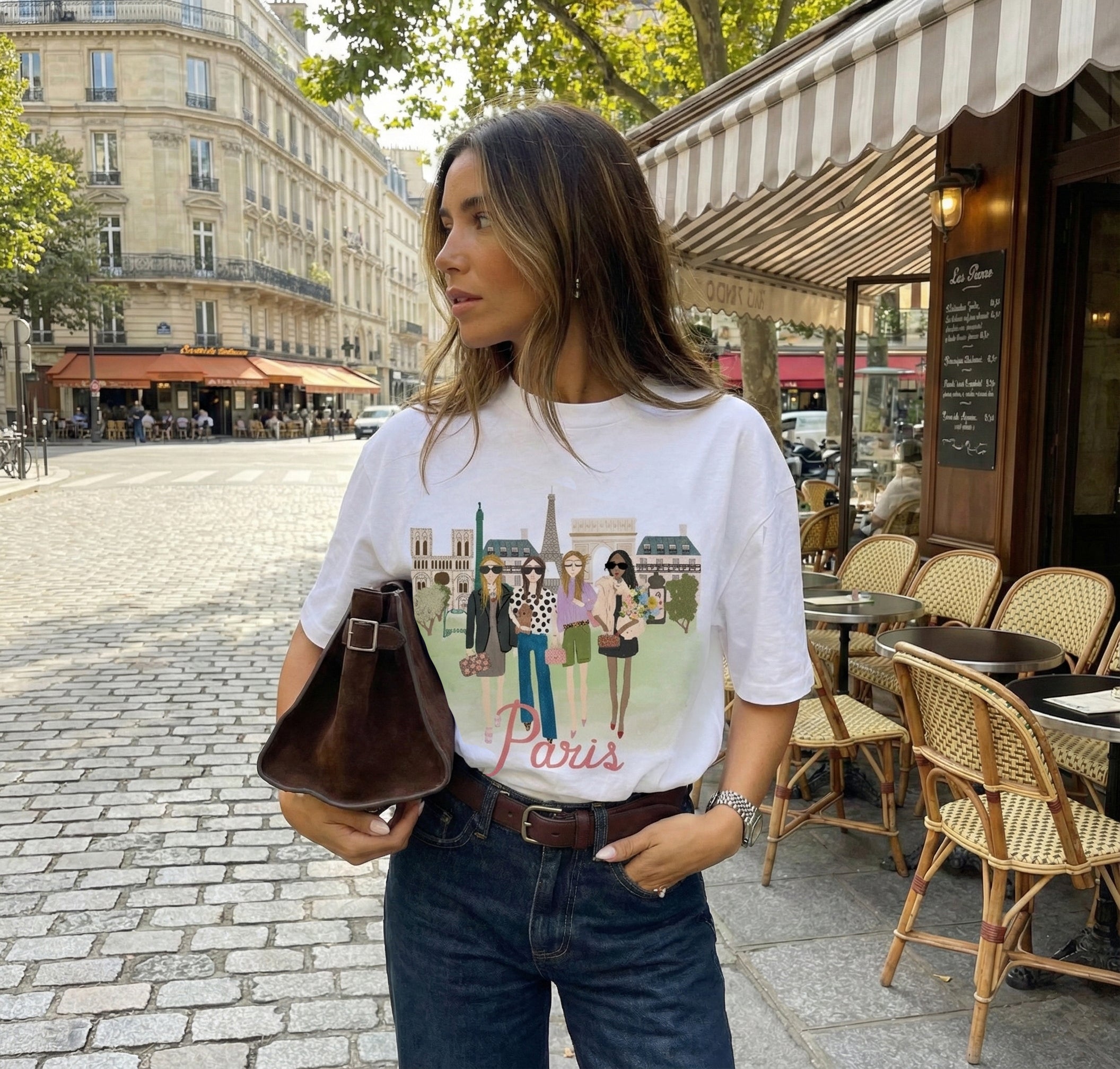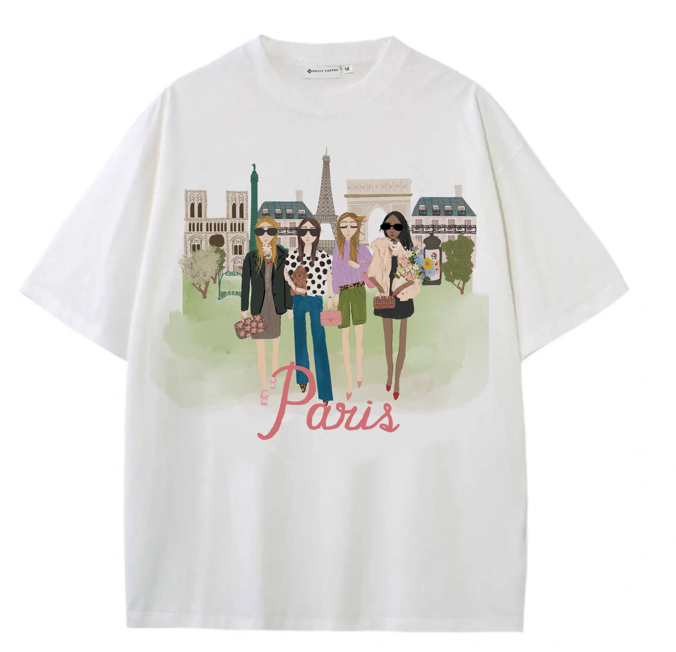 Girls in Paris is an illustrated T‑shirt that celebrates fashion and iconic Paris landmarks, featuring stylish women in front of the Eiffel Tower, Notre‑Dame, and the Arc de Triomphe. This artistic and elegant design is printed on crisp white cotton, perfect for anyone who loves illustration, style, and the charm of Paris